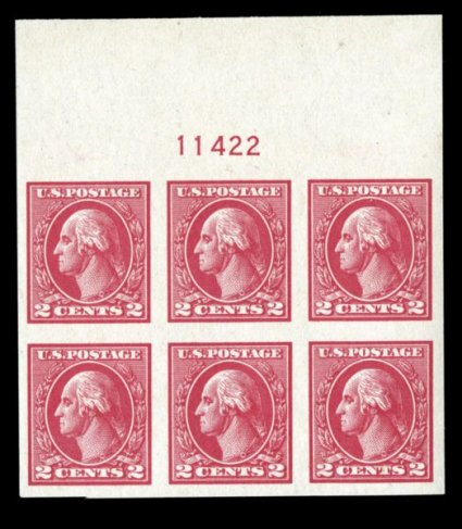 653 nhPB 534 image#534, 2c Carmine offset imperforate, Ty. Va, full top margin plate no. 11422 block of six, uniformly large margins, deep rich color, o.g., n.h., extremely fine. (Image) $200.00