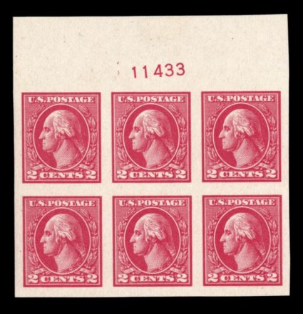 654 nhPB 534 image#534, 2c Carmine offset imperforate, Ty. Va, top margin plate no. 11433 block of six, possessing extra-large and wonderfully balanced margins all around, sumptuously rich color, remarkably clean pristine o.g., n.h., extremely fine. (Image) $200.00