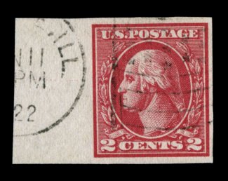 655 O 534B image#534B, 2c Carmine offset imperforate, Ty. VII, used left sheet-margin single, other margins full to large, brilliantly rich colo on pristine white paper, light machine cancel, very fine and quite handsome. (Image) $1,250.00
