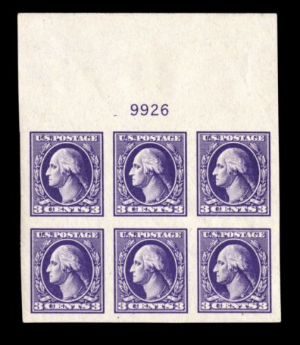 656 nhPB 535 image#535, 3c Violet offset imperforate, Ty. IV, full top margin plate no. 9926 block of six, with an extra-large sheet margin, other margins are huge and perfectly balanced, deep rich color, unblemished o.g., n.h., extremely fine gem. (Image) $125.00