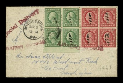 657 EDU 538a, 540a image#538a, 540a, 1c Green and 2c Carmine rose, vertical pair, imperforate horizontally, two pairs of each in quite well centered blocks of four, the 1c block is a bottom margin block, tied to special delivery cover by portions of Middletown, Pa. duplexes and the "Special Delivery" handstamps, September 5, 1927 earliest documented usage for both stamps, backstamped Detroit, Michigan the next day, very fine and attractive cover; when these coil waste issues were first issued some had no horizontal perforations between the top row and the selvage, because these were popular with collectors an order was made to produce some more of these, this order was misunderstood to mean completely imperforate horizontally, thus this variety came about and was virtually all saved by collectors mint, because they are so scarce used at the time caution must be used in obtaining contemporaneous cancels, covers with either value are very rare and a cover, such as this, with both values in blocks of four being the earliest documented usage is a find indeed; ex-Alpha". (Image) Est. 1,500-2,000