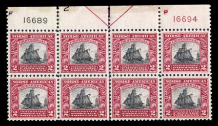 704 nhPB 620 image#620, 2c Norse-American, full top margin arrow and plate nos. 16689, 16694 block of eight, featuring an uncommonly wide sheet margin which is difficult to find on plate blocks of this issue, exceptionally fresh with strong colors, especially well centered, o.g., n.h., extremely fine. (Image) $290.00