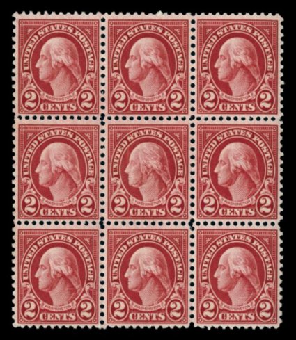 711 nhbl 634 var. image#634 var., 2c Carmine recut ("long ear") variety, the center stamp in a block of nine, well centered, bright color, o.g., n.h., very fine; an elusive variety that only comes from position 34 in the top right pane of plate no. 20342. (Image) $400.00+