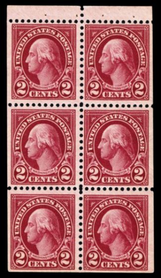 713 nhBP 634e image#634e, 2c Carmine lake, booklet pane of six, well centered, strong color in this distinctive shade, o.g., certificate states "never hinged" though the top left stamp has a light gum disturbance, very fine; only a handful of booklet panes in the carmine lake shade have been recorded, this being the first we have offered; 2005 PSE certificate. (Image) $4,000.00
