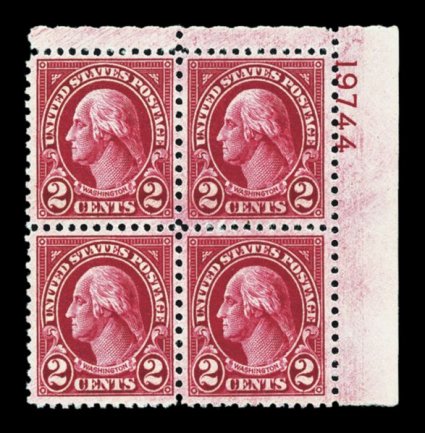 716 nhPB 634A image#634A, 2c Carmine, Ty. II, top right corner margin plate no. 19744 block of four, exceptionally well centered, radiant rich color, o.g., n.h., extremely fine; an elusive plate block that is especially rare in this choice quality. (Image) $2,750.00