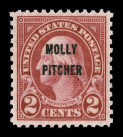 719 nhu 646 image#646, 2c Molly Pitcher, an incomparable mint example of this common stamp in a truly magnificent quality, being flawlessly centered within lavishly large margins, intense vivid color and a deeply etched impression, o.g., n.h., superb; 2006 PSE certificate (Gem 100 Jumbo; SMQ $170.00 for 98; unpriced in this remarkable grade); this is the only example to receive a grade of 100J, the ultimate grade for any stamp. (Image) $1.60