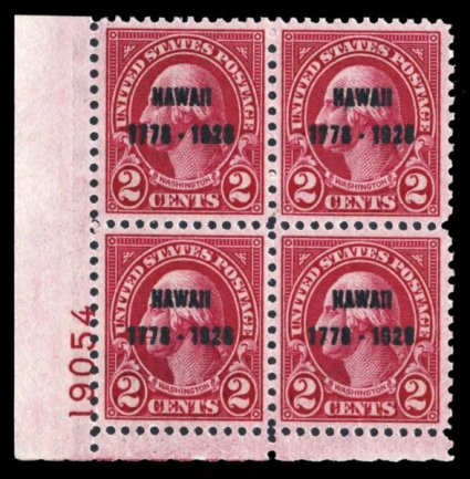 720 nhPB 647 image#647, 2c Hawaii Sesquicentennial, bottom left corner margin plate no. 19054 block of four, extraordinarily well centered, deep radiant color, o.g., n.h., extremely fine; quite challenging to find so choice. (Image) $250.00