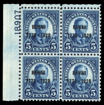 721 nhPB 648 image#648, 5c Hawaii Sesquicentennial, top left corner margin plate no. 18907 block of four, exceptionally well centered for this difficult plate block, deep luxuriant color, pristine o.g., n.h., extremely fine. (Image) $425.00
