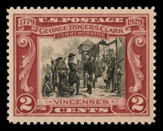722 nhu 651 image#651, 2c George Rogers Clark, exceptionally well centered within particularly large margins, attractive colors, o.g., n.h., extremely fine jumbo; 2006 PSE certificate (XF-Superb 95 Jumbo; SMQ $39.00 for 95, $160.00 for 98). (Image) $1.10