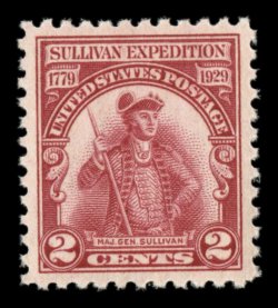 724 nhu 657 image#657, 2c Sullivan Expedition, exceedingly well centered within uncommonly wide margins, strong fresh color, o.g., n.h., extremely fine; 2006 PSE certificate (Superb 98; SMQ $155.00); only one grades higher (98J). (Image) $1.00