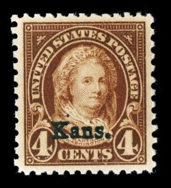 725 ogu 662 image#662, 4c "Kans." ovpt., perfectly centered within extra-large margins, deep rich color, o.g., current certificate states previously hinged although we believe it to be never hinged, extremely fine; 1999 PF certificate for a block of twelve from which this stamp was taken ("never hinged") and a 2004 PSE certificate as a single (Superb 98; SMQ $125.00). (Image) $20.00