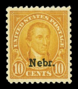 726 nh 679 image#679, 10c "Nebr." ovpt., an attractive example of this key value, featuring huge margins for this normally tightly-spaced stamp, exceedingly well centered as well, brilliant color, o.g., n.h., accompanying certificate mentions fingerprint on the gum, actually quite minor, extremely fine; 2004 PSE certificate. (Image) $230.00
