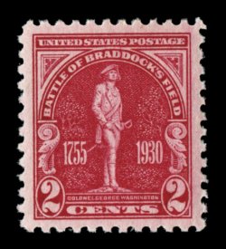 729 nhu 688 image#688, 2c Braddock's Field, gem mint single, featuring absolutely perfect centering within lavishly large margins, rich color, o.g., n.h., superb; 2006 PSE certificate (Superb 98; SMQ $165.00); the highest graded awarded to any example of Scott #688. (Image) $1.40