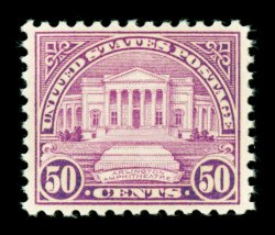 731 nhu 701 image#701, 50c Lilac, a pristine quality mint example of this high value, being a bottom right corner sheet-margin plate no. 20554 single, possessing extraordinarily large margins which are most uncharacteristic of this and being marvelously well centered within them, plus its color is a brilliant red lilac shade on bright white paper, o.g., n.h., an extremely fine gem; 2006 PSE certificate (XF 95; SMQ $250.00). (Image) $52.50