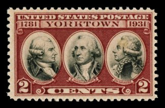 734 nh 703b image#703b, 2c Yorktown, dark lake and black error of color, centered slightly to the right, but actually better centered than many examples of this scarce color variety, which are often found with the design into the perforations at right, deep colors, o.g., n.h., very fine; 2001 PF certificate. (Image) $800.00