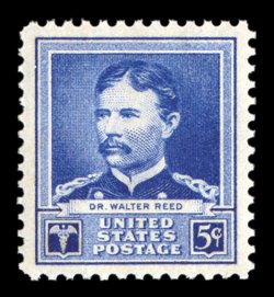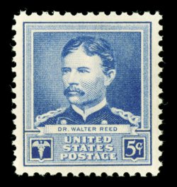 802 nhu 877 image#877, 5c Dr. Walter Reed, extraordinarily well centered, bright fresh color, o.g., n.h., extremely fine gem; encapsulated PSE certificate (Superb 98; SMQ $180.00). (Image) $0.25