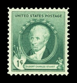 809 nhu 884 image#884, 1c Gilbert Charles Stuart, absolutely perfectly balanced margins all around, gorgeous rich color and an intense impression, o.g., n.h., superb; encapsulated PSE certificate (Gem 100; SMQ $480.00); one of six examples of this stamp to grade Gem 100, the highest grade assigned to any Famous American stamp. (Image) $0.20