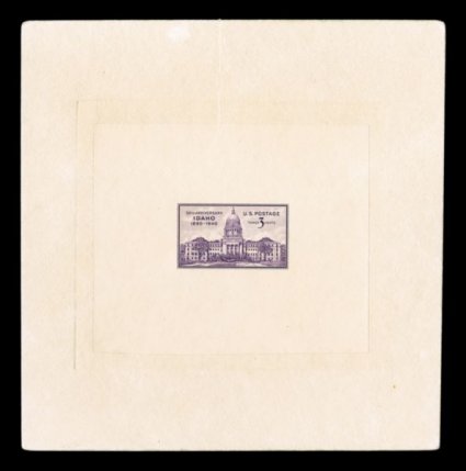 820 P 896P1 image#896P1a, 3c Idaho Statehood, large die proof on India, die sunk on card measuring 138x141mm, bright proof with clear color and impression, Bureau handstamp on the reverse reads "Engraver's Stock Proof/Authorized by" and initialed, light wrinkle at top of the card barely affecting the India, otherwise very fine; this is only the second example that we have seen of this rare proof, the other with a "C" security punch and produced in 1942, two years after issuance and thus on wove paper which was being used in 1942; while Scott lists this die proof on India this is the first example we have encountered in these late die proofs where the two different papers are found on the only recorded two proofs; W.K. Schrage, designer; J.R. Lowe, vignette engraver; control number 644241A (1940). (Image) $800.00