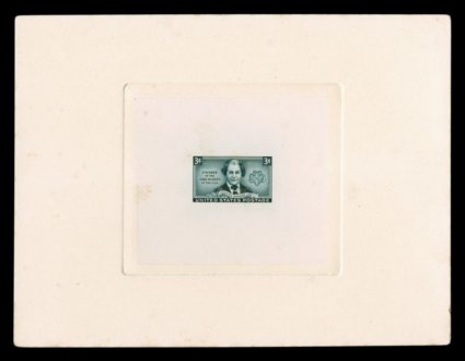 822 P 905P1a image#905P1a, 3c Win the War, large die proof on wove, die sunk on card measuring 130x146mm, Bureau handstamp on the reverse reads "Engraver's Stock Proof/Authorized by" and initialed, evidently displayed in sunlight as the color has faded, tiny corner flaw to the wove proof paper, fine; still an extremely rare and quite possibly unique proof, as this issue was not previously known in a large die proof and is not listed as such in Scott; furthermore, this proof lends credence to the theory that this small find of proofs largely came into public hands through J.S. Edmondson, as he is the only engraver that worked on this issue for both the vignette and the lettering; Mark O'Dea & W.A. Roach, designers; J.S. Edmondson, vignette engraver; control number 737107A (1942) (Image) Est. 400-500