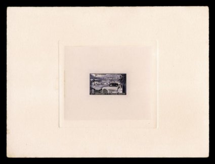 825 P 1012P1a image#1012P1a, 3c Engineering Centennial, large die proof on wove paper, die sunk on full size card measuring 202x153mm, Bureau handstamp on the reverse reading "Engraver's Stock Proof/Authorized by" and initialed, "C" security punch taped back in place (a normal practice), fresh and attractive with bright color, choice very fine; this proof is known from the vignette engraver M.D. Fenton offered in our June 2006 sale of the W. Curtis Livingston Collection, this second proof is probably from J.S. Edmondson, the letter engraver, these are the only two recorded, listed by Scott on India but unpriced, however both of these are on wove paper and it probably does not exist on India; (Image) Est. 750-1,000