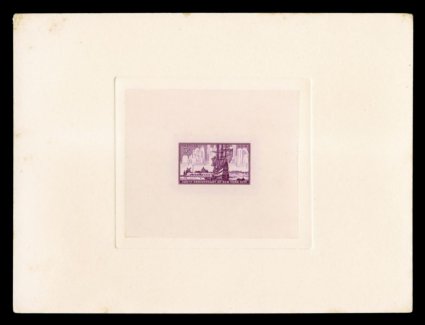 828 P 1027P1a image#1027P1a, 3c New York City Anniversary, large die proof on wove paper, die sunk on full size card measuring 202x153mm, Bureau handstamp on the reverse reading "Engraver's Stock Proof/Authorized by" and initialed, though erased the name "Edmondson" can be made out at bottom on the reverse, this being one of the few issues that he was the vignette engraver, "C" security punch taped back in place (a normal practice), intense violet color, choice very fine; an especially fresh and crisp proof; this is a new discovery that is unlisted by Scott and most probably the only known example of this die proof in public hands; C.R. Chickering, designer; J.S. Edmondson, vignette engraver; control number 131380B (1953). (Image) Est. 750-1,000