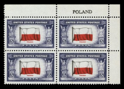 830 nhPB 909a image#909a, 5c Poland, double impression of "Poland", top right inscription block of four, exceptionally well centered, bright colors, o.g., n.h., extremely fine; a scarce variety, especially in an inscription block; 2005 PF certificate; listed but unpriced in Scott. (Image) Est. 1,000-1,500