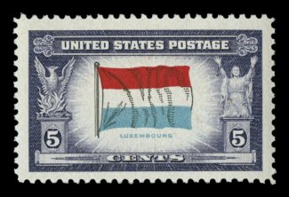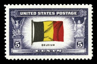 837 nh 914a image#914a, 5c "Belgium" Overrun Nations, double impression of "Belgium" inscription, perfectly centered, strong colors, o.g., n.h., extremely fine; a very scarce and seldom offered error; 2005 PF certificate. (Image) Est. 400-500