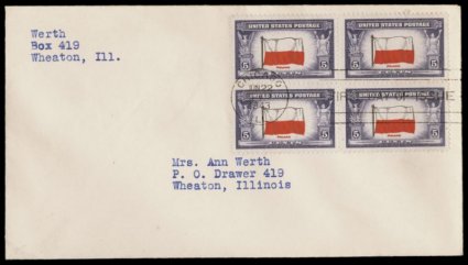 833 F 909c image#909c, 5c Poland, reverse printing, block of four tied to first day cover by Chicago Jun 22, 1943 machine cancel, bright and fresh, stamps very well centered, extremely fine; very few first day covers with reverse printings of any of the Overrun Nations series have been certified; 2006 APS certificate. (Image) Est. 200-300