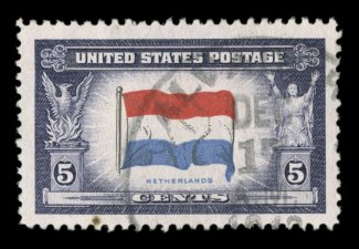 836 O 913a image#913a, 5c Netherlands, reverse printing, used, well centered and margined, light c.d.s. cancel, extremely fine; this is the only recorded used example of this error; 2006 APS certificate; listed but unpriced in Scott. (Image) Est. 150-200