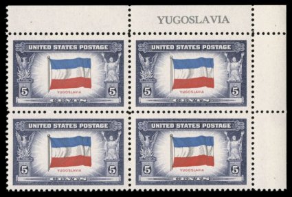 838 nhPB 917a image#917a, 5c Yugoslavia, reverse printing, top right corner margin name of four, exceptionally well centered and margined, strong bright colors, o.g., n.h., extremely fine; 2005 PF certificate; not priced as a name block.. (Image) Est. 200-300+