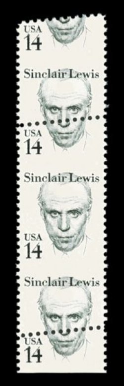 852 nh 1856 var. image#1856 var., 14c Sinclair Lewis, imperforate between, vertical strip of three showing one row of horizontal perforations omitted, other rows of perfs. shifted and slightly diagonal, according the the accompanying certificate this technically does not qualify as the rare #1856d, though still quite and eye-catching error, o.g., n.h., very fine; 2006 PF certificate. (Image) Est. 150-200