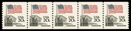 853 nh 1895a image#1895a, 20c Flag Over the Supreme Court coil, narrow block tagging, plate no. 4 strip of five, well centered, o.g., n.h., extremely fine; this is the scarce key strip of five for the numerous plates used on the two presses on which this issue was printed, 2005 PSE certificate. (Image) $575.00