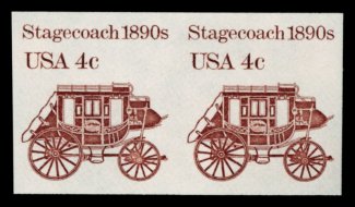 854 nh 1898Ad image#1898Ad, 4c Stagecoach coil, imperforate, pair, large even margins, bright color, o.g., n.h., extremely fine; one of the scarcer imperforate pairs from the Transportation Coil series. (Image) $800.00