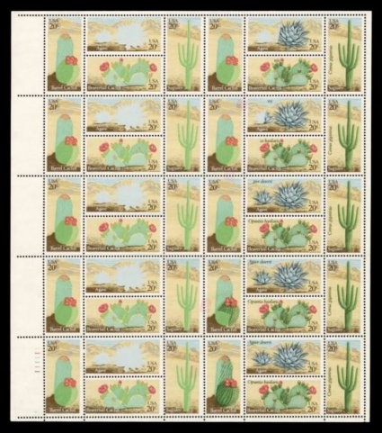 857 nhbl 1942-45 var. image#1942-45 var. 20c Desert Plants se-tenant block of four, engraved dark green and dark blue omitted, a spectacular new discovery of this striking error, consisting of a full bottom left plate no. 111111 7 pane of 40, the error is found on a little over half of the sheet being caused by a portion of a sheet being laid over this sheet as it went through the press applying the two engraved colors, the result is that all five se-tenant blocks of four on the left half of the sheet, including the unique plate block of four, are completely missing the engraved colors, in addition three other Barrel Cactus designs have the engraving entirely omitted, since the sheet that overlaid this sheet was at an angle an additional two Barrel Cactus, two Beavertail Cactus and three Agava stamps have portions of the engraving omitted ranging from just a small part of the inscription to the entire inscription and part of the design, o.g., n.h., very fine; the combination of being a se-tenant design and the way it occurred, affecting only a portion of the sheet, makes this an immensely rare color-omitted error, for comparison this same issue is known with the lithographed deep brown omitted and valued in Scott at $4,250.00 for a se-tenant block, there are 20 blocks of that error known, four times the number of the mere five blocks that are found in this newly recorded sheet. (Image) Est. 10,000-15,000