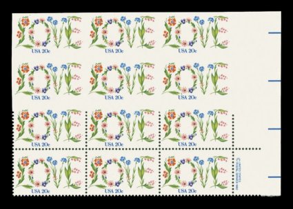 858 nhbl 1951b image#1951b, 20c Love, imperforate, three imperforate pairs contained in a transitional right margin block of twelve, o.g., n.h., tiny translucent spot on the top left stamp, still very fine; seldom found in this transitional format; 2005 PF certificate. (Image) $780.00+