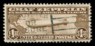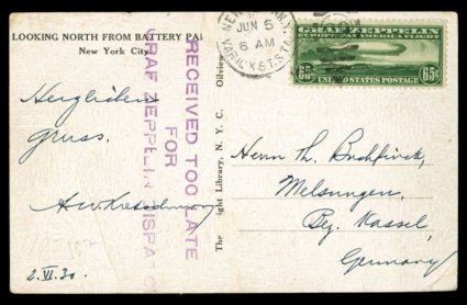 909 c C13 image#C13, 65c Graf Zeppelin, tied to multicolor view card to Germany by "New York, N.Y./ Varick St. Sta./Jun 5, 1930", by this date the "Graf Zeppelin" was over the Atlantic on its return trip to Germany, bold three line "Received Too Late/for/Graf Zeppelin Dispatch" purple handstamp, stamp is well centered and attractive, card with small faults including light creases, none affecting the stamp or marking, otherwise very fine; this card has a ms. date of "2.VI.30" by the sender, which would have been in time for the flight, whether the sender was delinquent in posting it or it was mishandled in the post office is not known, extremely rare usage and marking as this card and $1.30 cover in the next lot are the only examples we remember seeing in over 30 years of handling Zeppelin covers. (Image) Est. 200-300