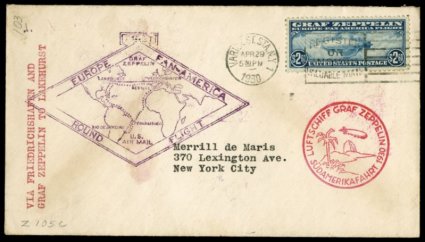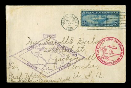 913 c C15 image#C15, $2.60 Graf Zeppelin, tied to cover by "Varick St. Sta., N.Y./May 1/ 1930" machine cancel, flown on the outbound flight Friedrichshafen to Lakehurst, violet diamond U.S. and red circular German flight cachets, backstamped, slight edge wear to the cover, stamp is fresh and nearly very fine. (Image) $600.00