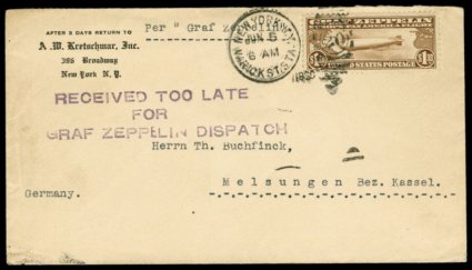 910 c C14 image#C14, $1.30 Graf Zeppelin, tied to cover to Germany by "New York, N.Y./ Varick St. Sta./Jun 5, 1930", long after the "Graf Zeppelin" departed on its return trip to Germany, bold three line "Received Too Late/for/Graf Zeppelin Dispatch" purple handstamp, stamp is exceptionally well centered and fresh, very fine; the schedule of the Zeppelin was well known in New York and the cost of sending cards and letters was no small sum in the midst of the depression, so postings that missed the flight are decidedly rare; this cover and the previous card are from the same correspondence, neither has any indication of the disposition of the two items, there was certainly sufficient postage paid for the them to be forwarded by ship, but no delivery markings are present, nor is there any instruction to return to the sender; extremely rare usage and marking as this cover and 65c card in the previous lot are the only examples we remember seeing in over 30 years of handling Zeppelin covers. (Image) Est. 400-500