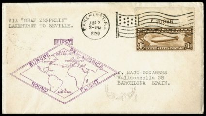 911 c C14 image#C14, $1.30 Graf Zeppelin, top sheet-margin plate no. F 20086 single, tied to flown cover by June 2, 1930 Lakehurst, N.J. flag cancel, flown on the return leg of the Pan-American flight to Seville, this is a much scarcer posting than the usual destination of Friedrichshafen (814 covers to Seville compared to 15,474 to Friedrichshafen), backstamped, both flight cachets, very fine. (Image) $400.00