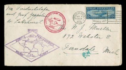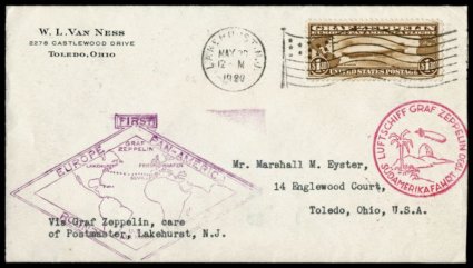 912 c C14 image#C14, $1.30 Graf Zeppelin, well centered single, tied to flown cover on the return leg of the Pan-American flight by May 30, 1930 Lakehurst, N.J. flag cancel, posted to Toledo, Ohio, Friedrichshafen backstamp, and green Zeppelin New York cancel on the reverse on its return to the United States, both flight cachets, very fine and choice. (Image) $400.00