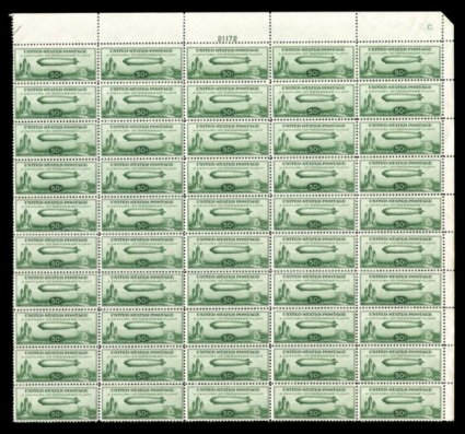 916 nhbl C18 image#C18, 50c Graf Zeppelin, top right plate no. 21172 pane of 50, several well centered stamps including the top plate block of six, bright color, o.g., n.h., some perf. separations between the seventh and eighth stamps in the fifth column, a very fine and scarce sheet. (Image) $5,100.00+