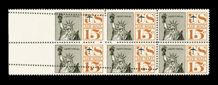 917 nhbl C63 var. image#C63 var., 15c Statue of Liberty, horizontal pair, imperforate between, left sheet-margin block of six, with the bottom left pair being imperforate between due to a foldover, also imperforate in the left margin and with the top left pair having misaligned perforations, o.g., n.h., very fine; this is the only recorded example of the imperforate between variety, and is even rarer than #C63b which catalogs $12,500.00, certainly deserving of a separate listing in Scott and Datz; 2006 PF certificate. (Image) Est. 3,000-4,000