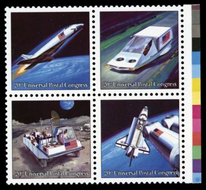920 nhbl C125b image#C125b, 45c UPU Congress, se-tenant block of four, light blue omitted, right sheet-margin block, bright and fresh, o.g., n.h., trivial fingerprint on one stamp, very fine. (Image) $750.00