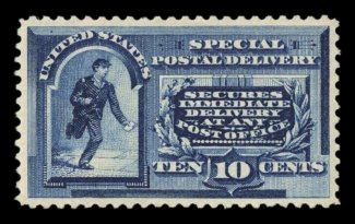 923 nh E5 image#E5, 10c Blue, pristine mint single, exceptionally well centered, deep intense color and a razor-sharp impression on fresh paper, o.g., never hinged, extremely fine and a pretty stamp; 2004 PSE certificate. (Image) $425.00