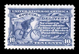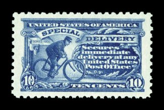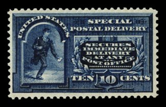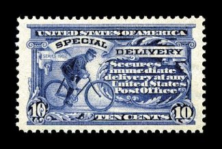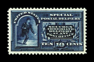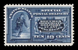 921 ogu E1 image#E1, 10c Blue, a most impressive mint single, being impeccably well centered within large balanced margins, rich bright color and an excellent clarity of impression, o.g., extremely fine gem; 2006 PSE certificate (XF-Superb 95; SMQ $1,550.00). (Image) $450.00
