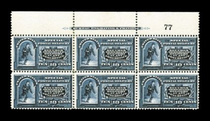 926 ogPB E5 image#E5, 10c Blue, an attractive top margin Ty. III imprint and plate no. 77 block of six, incredibly fresh color and prooflike impression on bright paper, overall well centered, pristine o.g., lightly hinged, left vertical row with separated and reinforced perforations, otherwise a very fine example of this rare plate block. (Image) $4,500.00