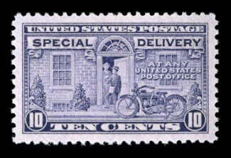 922 og E2 image#E2, 10c Blue, lovely rich color and a crisp impression, extraordinarily well centered within large margins, o.g., most recent certificate states "slightly disturbed o.g. and reperforated at right", extremely fine appearance; clear 1982 and 2001 PF certificates, and a 2006 PSE certificate. (Image) $400.00