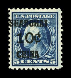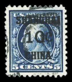 952 Ou K5 image#K5, 10c on 5c Blue, lovely used single, especially well centered within exceptionally large margins, rich color, cancelled with portion of duplex pmk., extremely fine; a premium used Shanghai overprint; 2006 PF certificate (XF 90; SMQ $210.00). (Image) $75.00