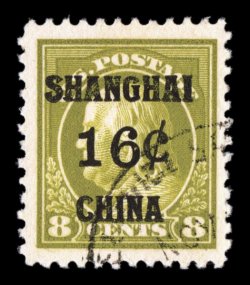 955 Ou K8a image#K8a, 16c on 8c Olive green, jumbo-margined used single, being wonderfully well centered within these lavish borders, especially deep and luxuriant color, portion of Shanghai Postal agency c.d.s., extremely fine gem; 2006 PF certificate (XF 90 Jumbo; SMQ $200.00 as 90 and $415.00 as 95). (Image) $60.00