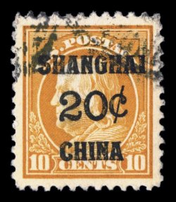 957 Ou K10 image#K10, 20c on 10c Orange yellow, gem used single, magnificently well centered and margined, brilliantly fresh color on clean white paper, plus lightly cancelled at top with portions of the U.S. Post Office in Shanghai cancels, extremely fine; used examples of the Shanghai overprints are especially elusive, especially in this highly select quality; 2006 PF certificate (XF-Superb 95; SMQ $415.00). (Image) $70.00